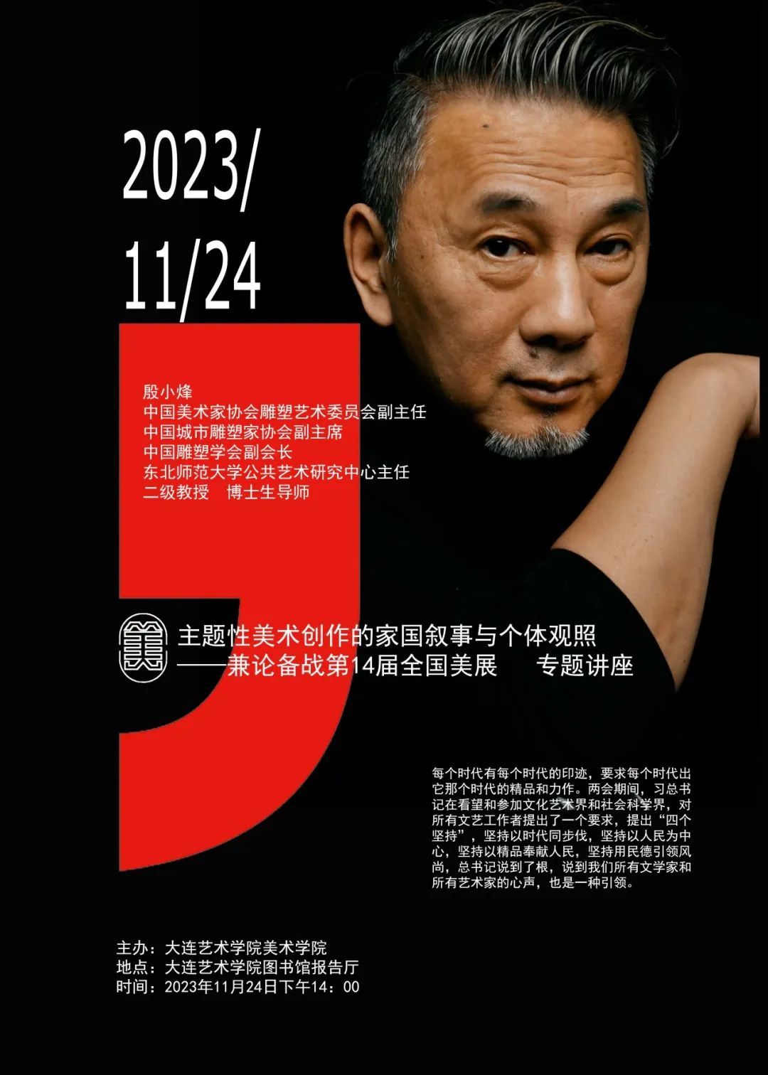 主讲人简介殷小烽,男,1963年3月出生于吉林省长春市,汉族,民进党。1980年考入长春市艺术中学,1983年考入于鲁迅黑人内射野战av雕塑系,1988年就职于东北师范大学黑人内射野战av至今。社会任职现任东北师范大学黑人内射野战av二级教授、博士生导师,东北师范大学传媒学院教授委员会委员,东北师范大学公共艺术研究中心主任